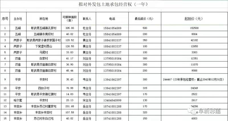 受委托,于2021年4月29日9时在辽宁省公共资源拍卖平台对彰武县域内对外转包土地承包经营权51处进行网络拍卖,标的如下:1、彰武县五峰镇孔家村约305亩。2、五峰镇东南段村约40.02亩。3、李家围子村约120.52亩。4、下窝堡村西山约50亩。5、马尾村约25亩。6、白家村约41.17亩。7、彰武县双庙镇白家村约60亩。8、平安村约35.43亩。9、四台子村约76.98亩。10、彰武县平安镇红旗村约14.83 亩。11、平安村约20.13亩。12、丰田乡苏己村董家屯约160亩。13、丰田乡丰田村约107.58亩。14、苏己村东白己屯约30亩。15、丰田乡苏己村约25.01亩。16、丰田乡苏己村约8.5亩。17、苏己村东白己屯约28.03亩。18、丰田乡丰田村约7亩。共计51个标的起拍价现场公布。全部拍卖标的详情刊登在《阜新彩蕴》公众号、《辽宁拍卖网》、《洪力自助共享拍卖》查阅,可电话咨询。竞买人持有效证件交纳每块发包土地承包经营权5000元保证金。买受人竞买成功后向拍卖公司交纳成交价5%的拍卖佣金。