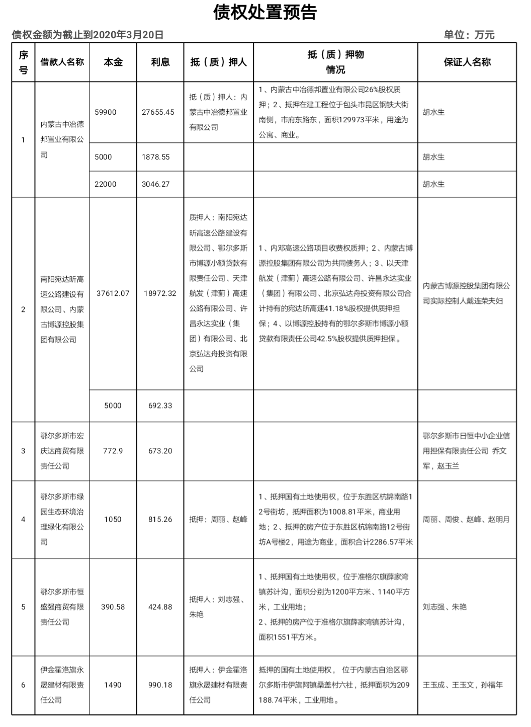 中国长城资产管理股份有限公司内蒙古自治区分公司债权处置预告