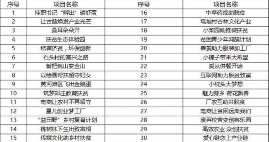 上周,活动组委会邀请相关专家在隐藏了申报人相关信息的前提下,对初选通过的52个项目进行了综合评审,从项目的公益性、可落地性、可参与性、可持续性、可复制性等方面优选出30个项目,目前已成功上线腾讯公益 平台,并参加后期的“99公益日”活动!项目名称列表(排名不分先后)如图: