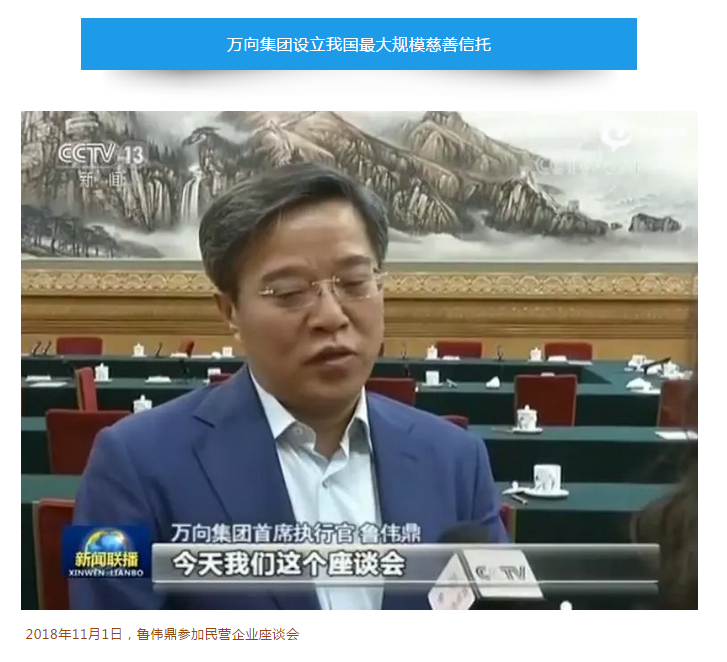 万向德农公告称,“鲁冠球三农扶志基金”是为了纪念万向集团公司创始人、万向董事局主席鲁冠球先生,并且遵循他的情怀境意,由鲁伟鼎设立和命名的慈善信托。2018年10月24日,全国工商联发布了由中央统战部、全国工商联共同推荐宣传的“改革开放40年百名杰出民营企业家”名单,其中就有已故万向集团董事局主席鲁冠球。