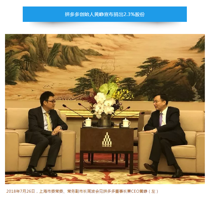 2018年7月26日晚间,“新电商第一股”拼多多在上海、纽约同时敲钟,正式登陆纳斯达克市场。其发行价19美元,总市值达240亿美元。招股书显示,拼多多创始人、董事长兼CEO黄峥将在IPO后捐出其拥有的2.3%公司股份成立私人慈善基金,推动企业社会责任建设。