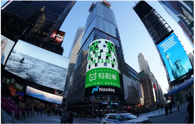 2016年6月、2018年2月及2018年10月,轻松筹曾先后登上纳斯达克大屏,向世界展示中国企业的风采,也唤起更多人对于健康的关注。