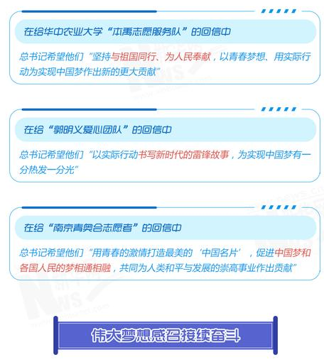 在给华中农业大学“本禹志愿服务队”的回信中,总书记希望他们“坚持与祖国同行、为人民奉献,以青春梦想、用实际行动为实现中国梦作出新的更大贡献”。