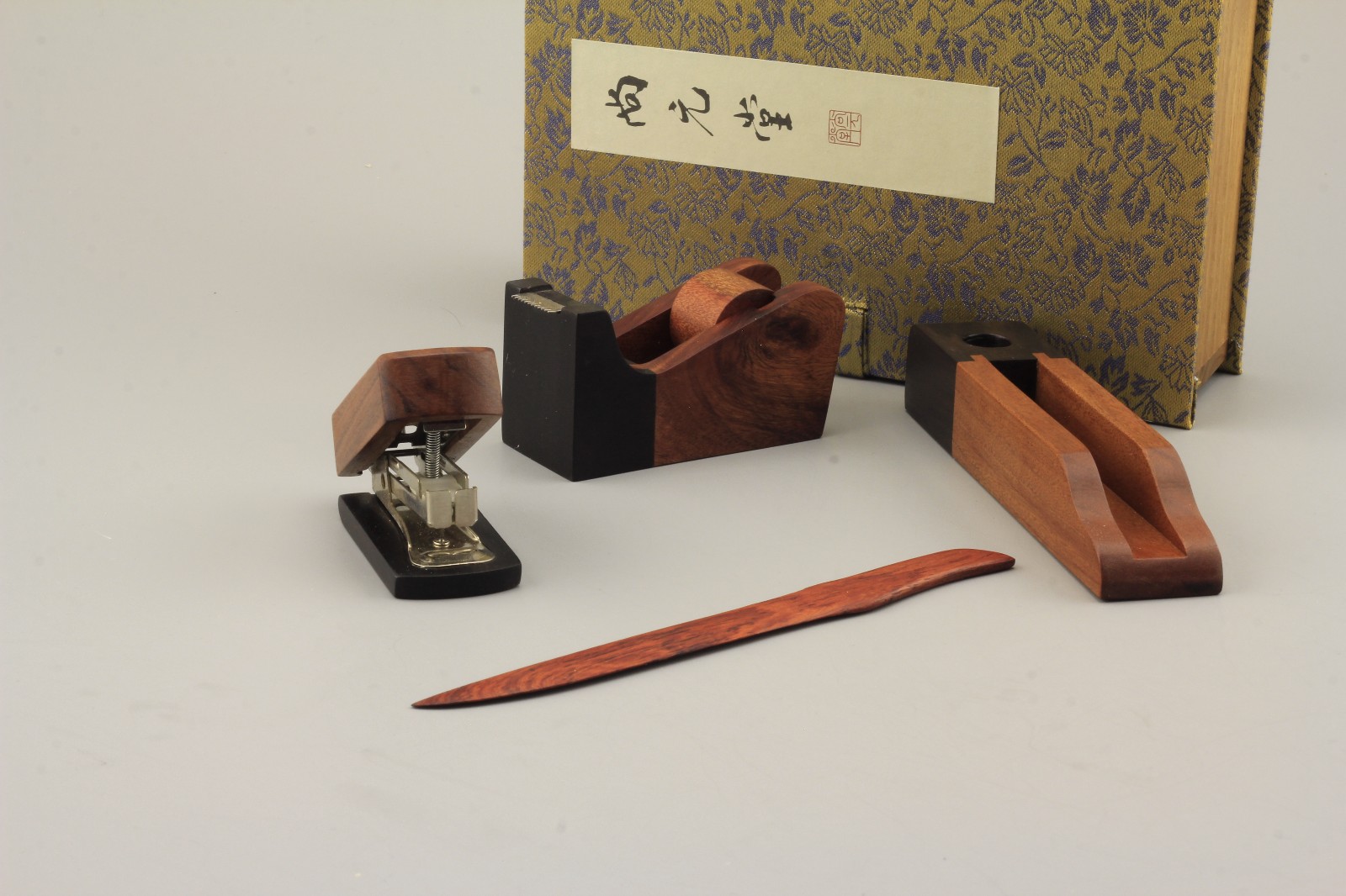 玲珑办公系列选用上乘紫光檀(国标红木—东非黑黄檀)、非洲酸枝(名贵硬木),运用传统刮毛、烫蜡等传统工艺精制而成。将传统文化融入现代便捷办公中,精巧雅致,简洁实用,套装配以收纳盒,方便桌面整理收纳。