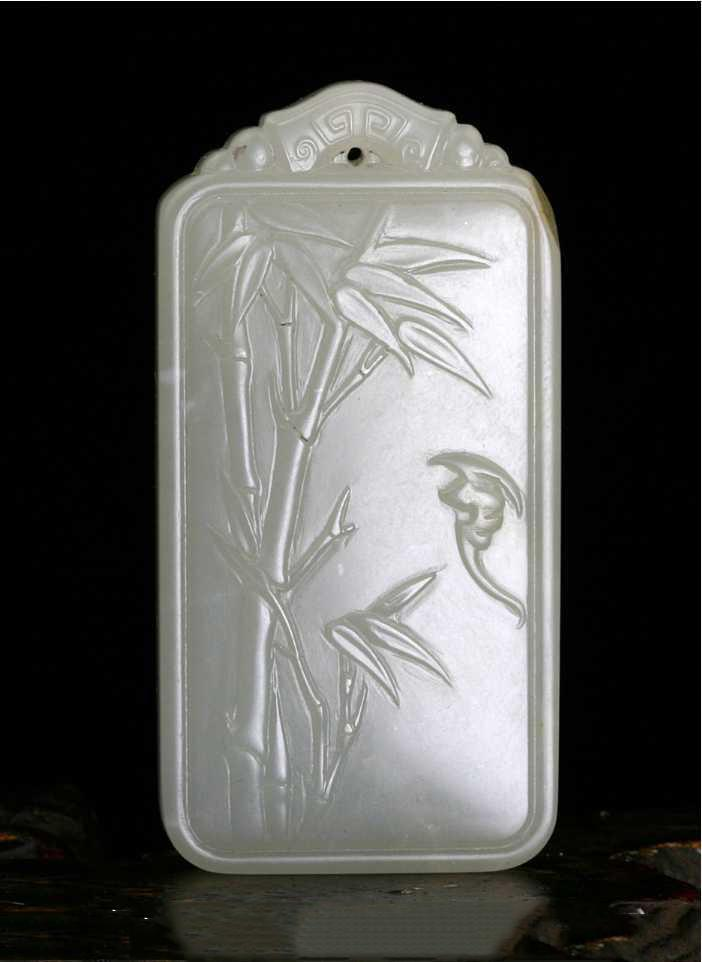 【描述】 和田白玉质,牌呈长条形,牌首回纹,正面琢刻一丛繁茂竹子,一只飞蝠飞过。主纹饰表达了祝福之意。玉牌玉质温润,雕工细腻精美,为不可多得的精品。