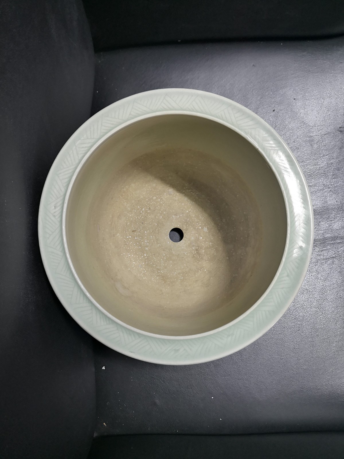 【描述】此花盆造型极为罕见,边缘挺拔,形制规整,盆底有圆形出水孔,足为圈底圆足,侧面有花形图案,非常好看又别致,釉色为冬青釉,内外施釉,青中闪绿,釉层均匀,光泽淡雅。
