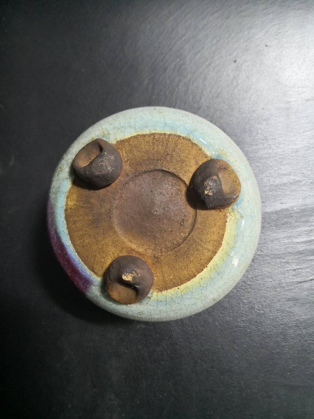 【描述】鬲炉体型小,平口内倾,折沿,直颈,垂鼓腹,炉底平,承三外撇小足。外壁满施天蓝色釉,内里未施满釉,三足及外底涩胎。口沿等釉薄处隐现胎骨而泛褐色,釉层气泡密集,釉色纯净,釉光润泽。此器紫斑呈现不同层次的深浅,浓艳得宜,仿似漫天彩霞,为钧窑紫斑器中的精品。