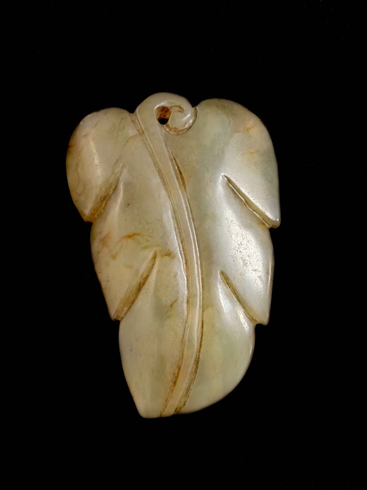 【描述】此件玉质细腻温润,整件是叶子形状,上面雕有蝙蝠,线条流畅,栩栩如生,寓意吉祥如意,象征富贵、福寿双全。