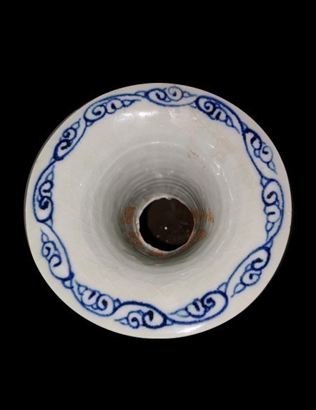 【描述】该瓶口呈喇叭状,细颈,垂腹,圈足,造型别致。其外壁通体以青花釉里红为纹饰,内口边则细腻地描绘着青花卷草纹。整器图案层次分明,从颈部的蕉叶纹到肩部的宝相花莲瓣纹,再到腹部的双边棱形开光和莲瓣纹,无不体现出匠人的匠心独运。特别值得一提的是,开光内堆塑的缠枝花叶和两种花纹,以青花饰叶、釉里红饰花朵,使得整器在色彩上既丰富又和谐。