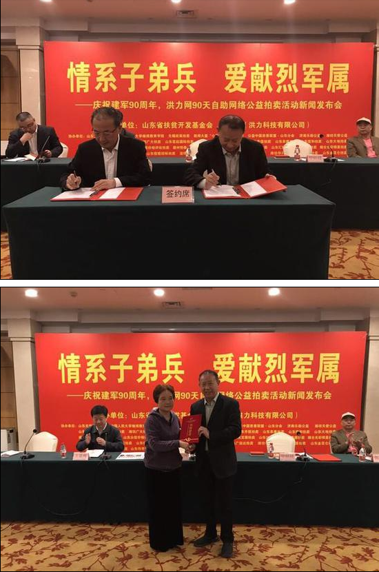 2017年4月18日,为了庆祝建军90周年,由山东省扶贫开发基金会和洪力网主办、公益中国慈善联盟.山东分会、小荷爱心联盟等20多家单位协办的情系子弟兵、爱献烈军属,洪力网90天自助网络公益拍卖活动新闻发布会在山东新闻大厦隆重举行。