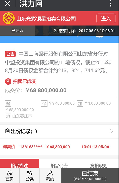 据悉,2017年5月6日上午10时,中国工商银行股份有限公司山东省分行所享有的中塑投资集团有限公司的债权在洪力网进行了公开拍卖,。