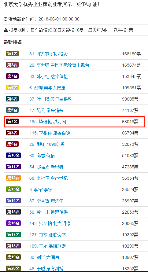 2018年,恰逢北京大学建校120周年,为了展示北京大学优秀企业家创业者风采,优秀北京大学企业家创业者展示评选组委会主办了“北京大学优秀企业家创业者展示,给TA加油!”活动,经过近20天的投票,洪力网创始人、董事长毕研挺在176名展示者中脱颖而出,获得68016票,荣获第七名!