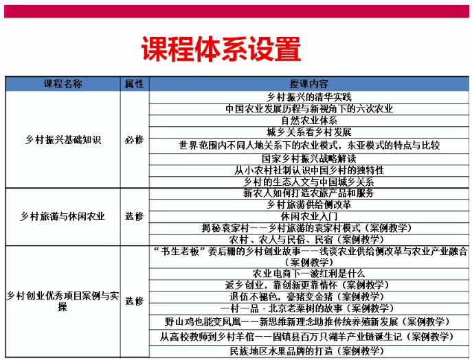 首期培训分为两个阶段。第一阶段为线上培训,课程内容丰富、精彩实用,涵盖乡村旅游、社区建设、金融政策、电子商务等。线上培训历时5个月,每周三次,学员们可自行选修自己感兴趣的内容。