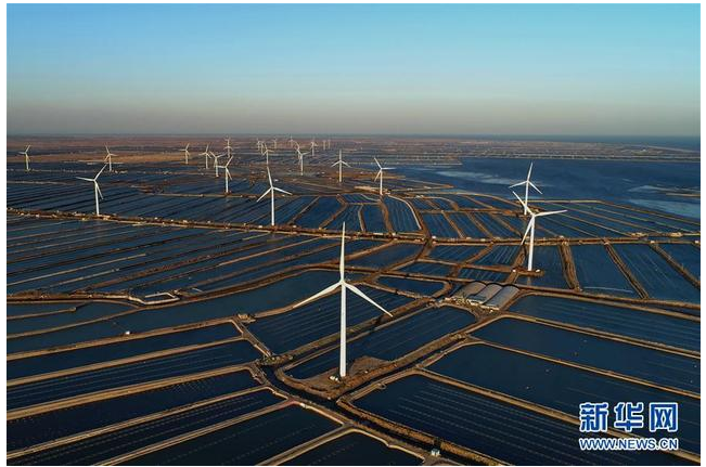 这是河北省唐山市乐亭县姜各庄镇海边养殖区内的风电场(11月10日无人机拍摄)。新华社记者 杨世尧 摄