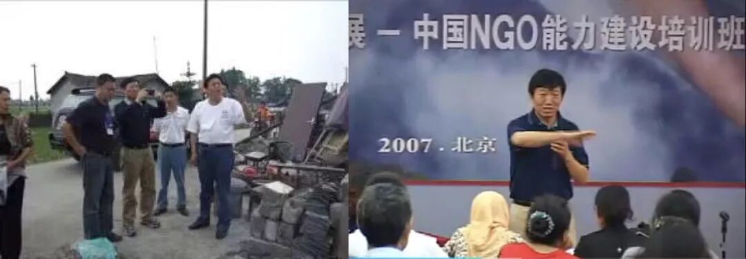 左:2008年5月汶川地震后,何道峰携团队赶赴绵竹震区考察救援。右:2007年,何道峰为国内NGO组织培训。