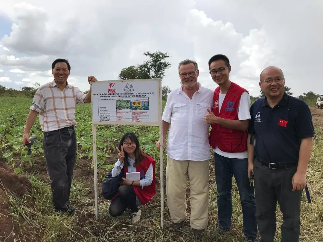 何道峰(左一)考察在南苏丹边境资助的向日葵种植项目