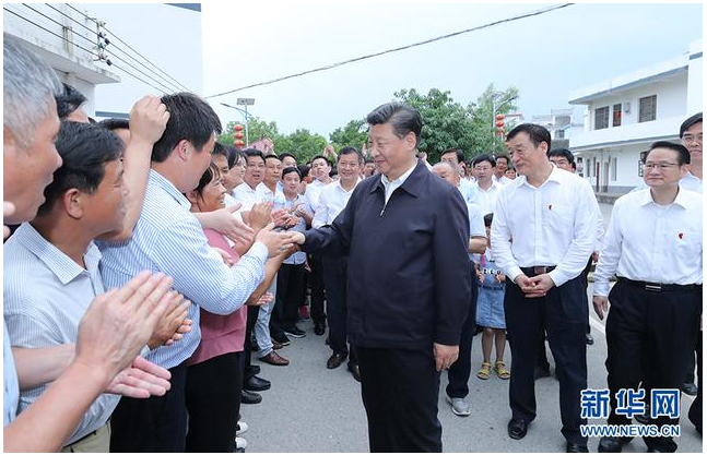 5月20日至22日,中共中央总书记、国家主席、中央军委主席习近平在江西考察,主持召开推动中部地区崛起工作座谈会并发表重要讲话。这是习近平在赣州市于都县梓山镇潭头村看望当地群众,同乡亲们亲切握手。 新华社记者 鞠鹏 摄