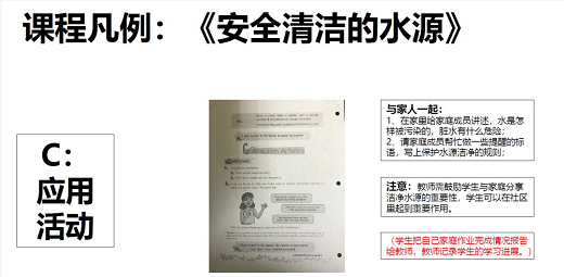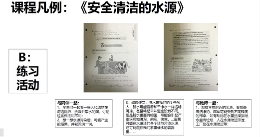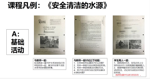 ▲较早版本的《学习指南》 《学习指南》涵盖6个学科,数学、语文、社会、科学、技术和伦理,覆盖了9个年龄段,所以它是6*9应该是54个。但是它第一个级别是4本,应该正好是50本。教师只有一个一般性的教师指导手册,没有一个教案,每一个分龄,比如3年级、4年级没有单独的教案,只有一本教学指南。 哥伦比亚新学校的课程模式 在这个课程的考察中,我认为比较突出的特色是这五个: 第一是以学生自学为主的学习方式; 第二是高度的结构化、标准化的内容与灵活性的兼容。“自学”大家会联想到高度标准化的、一个模式化的、程序化的东西,但是这个课程模式中你会看到它在学习节奏的掌握和整个学习的过程中是非常灵活的,不会因为老师的水平不同有太大的波动,也不会因为教学进度人为的拉快或者拉慢去改变它。 第三是书本知识和生活技能的结合,就是生活教育,这与它农村的社区和一般的生活教育是高度统一的。 第四是课内学习与家庭社区参与的统一。 第五是学习能力培养与价值观教育并重。 学习指南课程样例 给大家看一个课程的样例:《安全清洁的水源》。大家注意,教师在什么时候出现,教师在哪个环节干什么,因为"自学为主,老师指导为辅"的原则,老师什么时候出现给学生支持,这其实是它的关键。