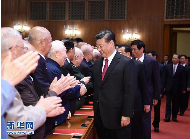 19时55分,在欢快的乐曲声中,习近平等领导同志步入大礼堂,同老同志代表亲切握手,向他们致以崇高敬意,全场响起热烈掌声。