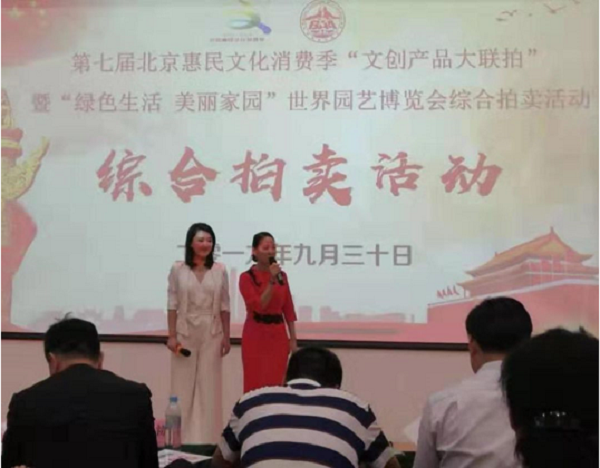 由北京市文资办、北京市文物局、北京市商务局、北京世界园艺博览会事务协调局支持,北京拍卖行业协会主办,中国拍卖行业协会、天津市拍卖行业协会、河北省拍卖行业协会、内蒙古拍卖行业协会、山西省拍卖行业协会、北京市商业联合会、内蒙古绿色农畜产品输出协会协办,天正阳光司辅(北京)科技有限公司、北京华辰拍卖有限公司、中国嘉德国际拍卖有限公司等承办,“洪力网”提供网络支持的第七届北京惠民文化消费季“文创产品大联拍”暨“绿色生活 美丽家园”世界园艺博览会综合拍卖活动启动仪式于2019年9月30日在北京世界园艺博览会生活体验馆成功举办。