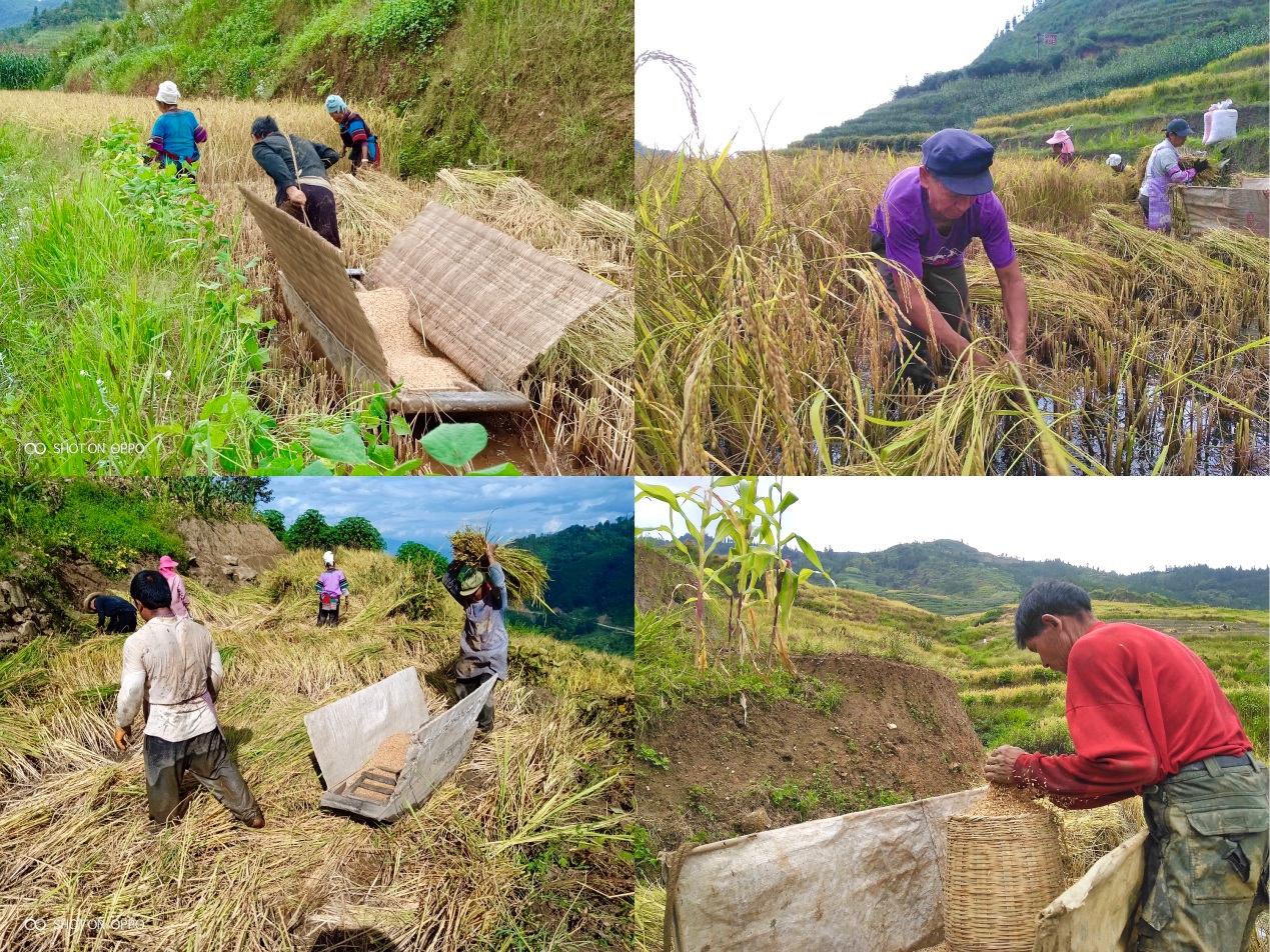 红米在梯田种植,要靠人工插秧、灌溉、收割,在田里把谷子摔打下来之后装袋,由马驮、人背的方式,穿过狭窄的田埂送到路边再运回家,需要大量的人力。村子里一户长期在家务农的老汉告诉记者,“家里劳力越来越少,如果没有加入合作社,我早就没了种红米的动力”。
