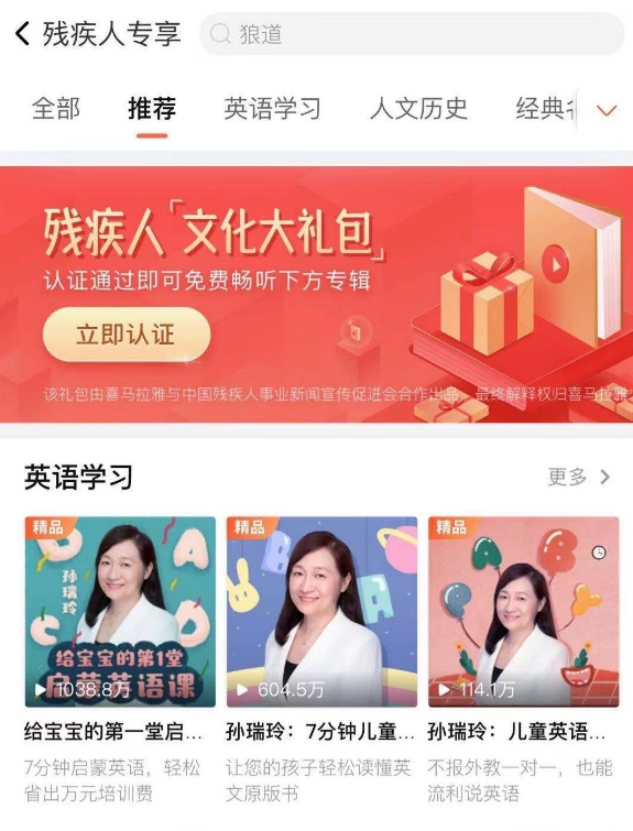 据悉,喜马拉雅精选平台上近百名优质主播的经典名著、人文历史、儿童国学、家长教育、个人成长、英语学习、儿童教育等9大类近300部付费内容专辑,每份价值超过9000元的文化大餐,作为残疾人大礼包的启动内容。