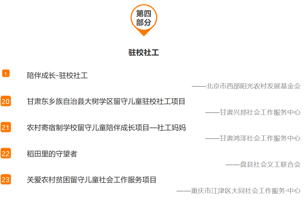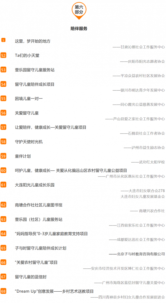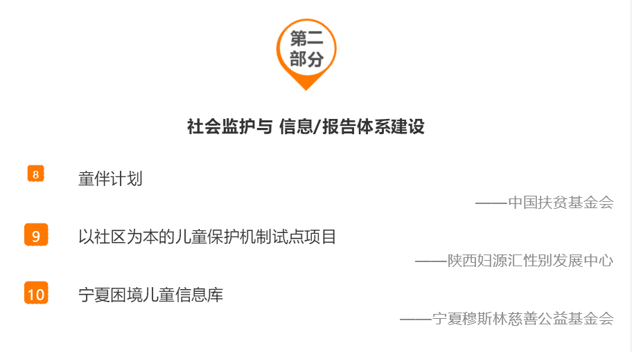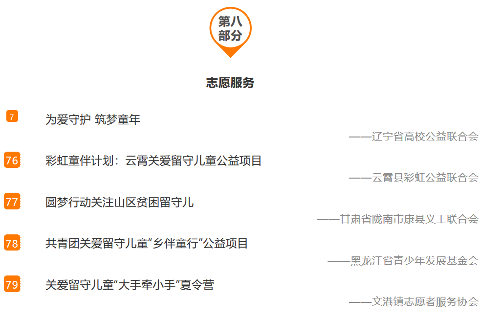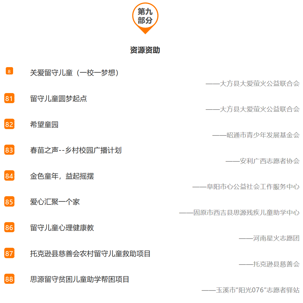 农村留守儿童公益项目名录,囊括了88个公益慈善项目。名录的信息搜集流程包括基本信息搜集、项目征集、筛查、确认与按逻辑框架梳理等几个步骤。