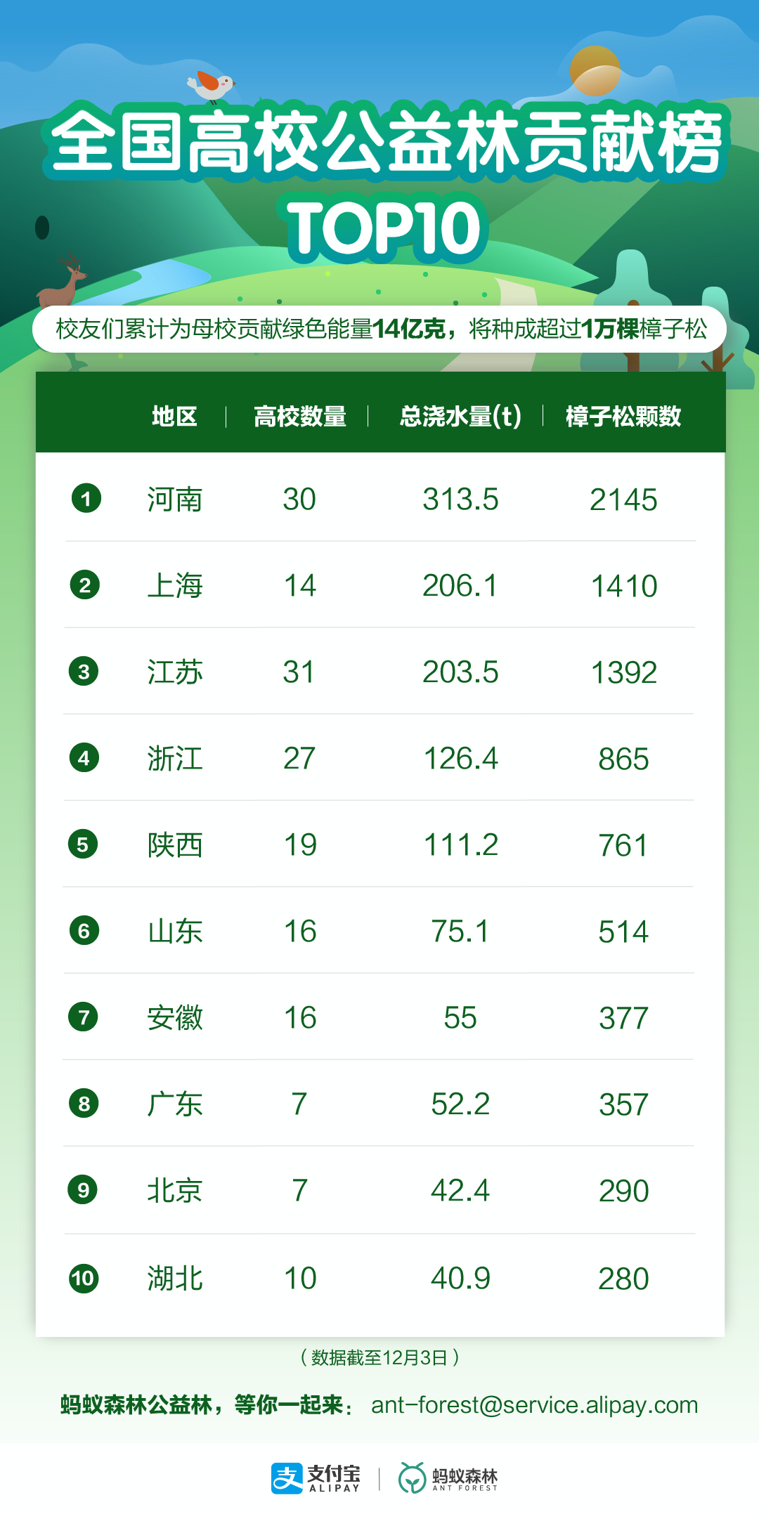 自今年6月上线以来,蚂蚁森林已经有近300所高校加入种树,校友们累计为母校贡献绿色能量14亿克,将种成超过1万棵樟子松。和校友们一起在支付宝蚂蚁森林里给母校种一片公益林,成为许多人生活中的日常。