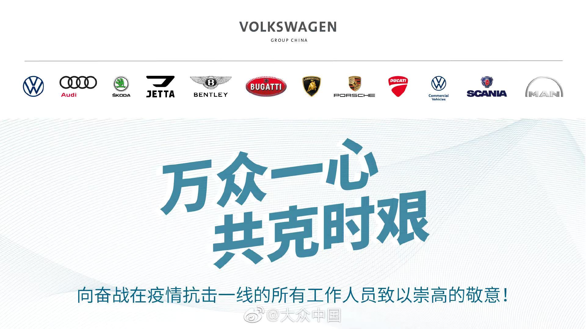 “我们高度关注疫情的发展态势,并向英勇奋战在疫情抗击前线各个岗位上的工作人员致以崇高的敬意。大众汽车集团(中国)与全国人民并肩作战,全力以赴抗击疫情”,大众汽车集团(中国)CEO冯思翰博士表示,“对于大众汽车集团而言,中国是我们的第二故乡,面对疫情的突袭,我们与中国民众万众一心,共克时艰。”