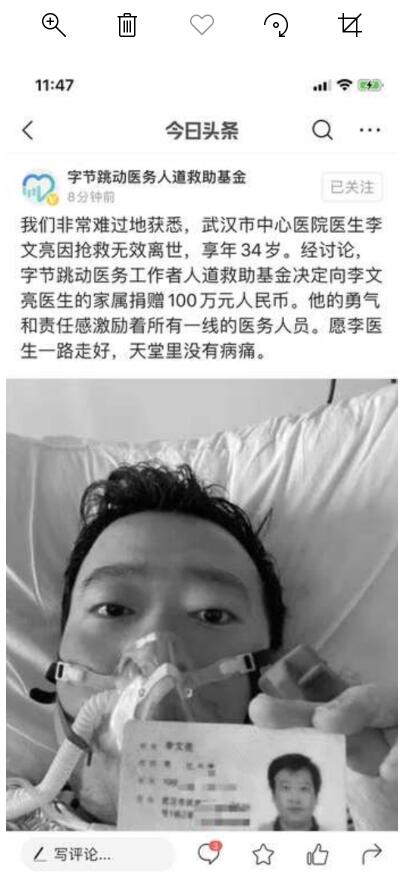 2月6日,武汉医生李文亮因感染新型冠状病毒的肺炎,抢救无效离世。当晚,字节跳动医务人道救助基金宣布向李文亮医生家属捐赠100万元人民币。