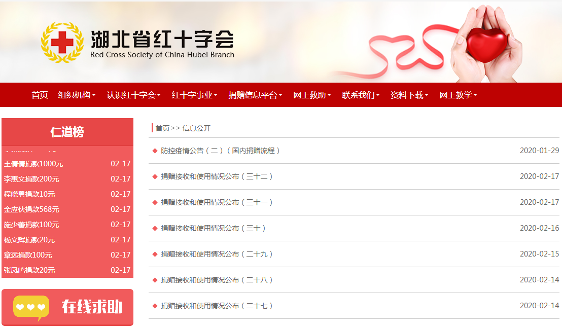 1月26日,湖北省新型冠状病毒感染的肺炎防控指挥部发布通告,指定湖北省红十字会作为接受捐赠的主体之一。此后,湖北省红十字会接收的社会捐赠迅速增长。