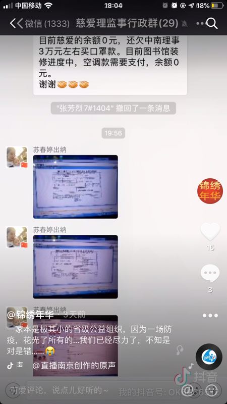 在一条抖音短视频中,罗炳章晒出了几张机构理监事行政群对话截图,其中一张截图显示,福建慈爱之光财务余额一度为0,甚至“还欠中南理事3万元左右买口罩款”。