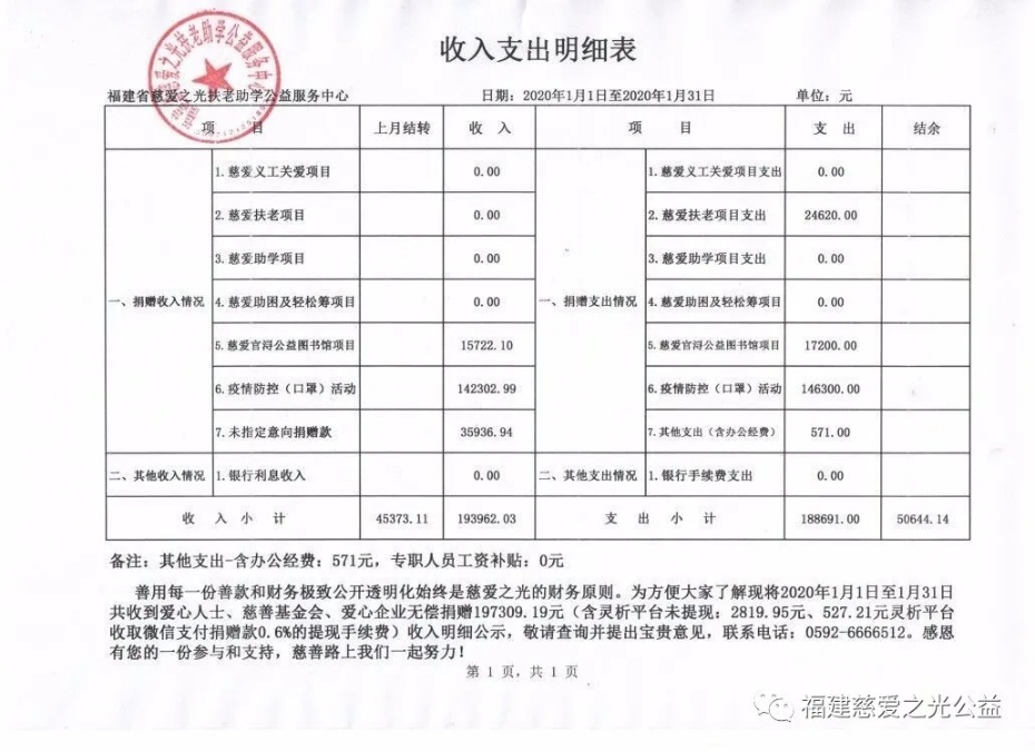 福建慈爱之光1月捐赠收入支出明细该机构1月份公布的财务明细显示,2020年1月,机构收到用于疫情防控的捐赠142302.99元,支出146300元。值得欣慰的是,在此次公益计划筹备的过程中,福建慈爱之光邀请当地公益机构共同参与,厦门绿链慈善基金会和福建正荣基金会等决定联合发起,两家基金会分别资助4.2万元和3万元,在资金和物资发放过程中都给予了很大支持。