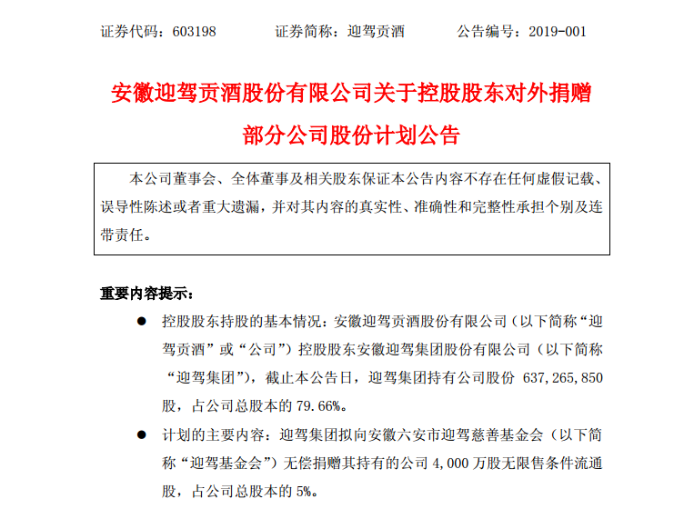 2019年3月22日,迎驾贡酒发布公告表示,公司于3月21日接到迎驾集团转发的中国证券登记结算有限责任公司上海分公司出具的《过户登记确认书》,迎驾集团向迎驾基金会捐赠其持有的公司4000万股股份过户手续已全部办理完毕。