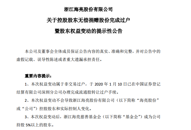 2020年1月14日,海亮股份发布公告表示,公司于 2020 年 1 月 13 日收到海亮集团的通知, 海亮集团与基金会的非交易过户已经在中国证券登记结算有限公司深圳分公司完成了过户登记手续,并出具了《证券过户登记确认书》。