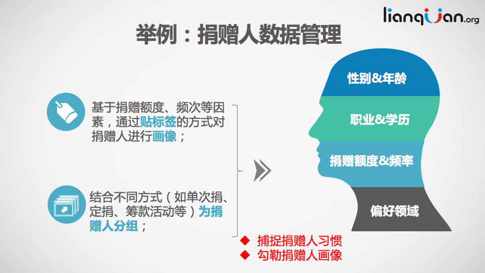其中,最直接最基础的方式是“贴标签”,例如捐赠人的性别、年龄、职业、捐赠额度和频率、捐赠偏好等。捐赠人的来源是千差万别的,如项目、活动、历史积累、线下渠道等。捐赠人画像来源于底层的数据积累和分析。在这方面,联劝网提供了相应的工具支持:捐赠人服务系统SCRM。入驻联劝网平台并开展筹款的伙伴都可以免费开通和使用这套系统,从而有效地进行捐赠人服务。