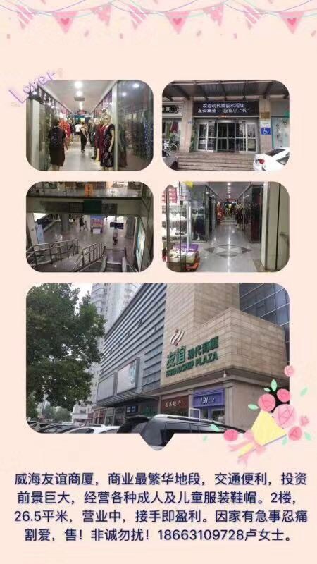 威海市海港路80号友谊商厦内部商铺,26.5平米,营业中,坐落于威海最繁华地段,位置好,上升空间巨大,各路公交车的交集点,旅游购物的好去处,因急用钱,忍痛割爱。