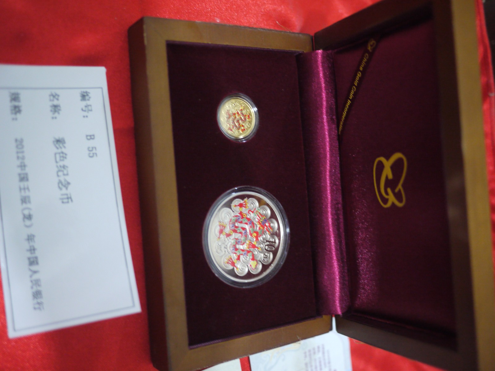 | 彩金银龙纪念币1套(2枚)金币1枚,重十分之一盎司,面值50元;银币1枚,面值10元,重一盎司 |