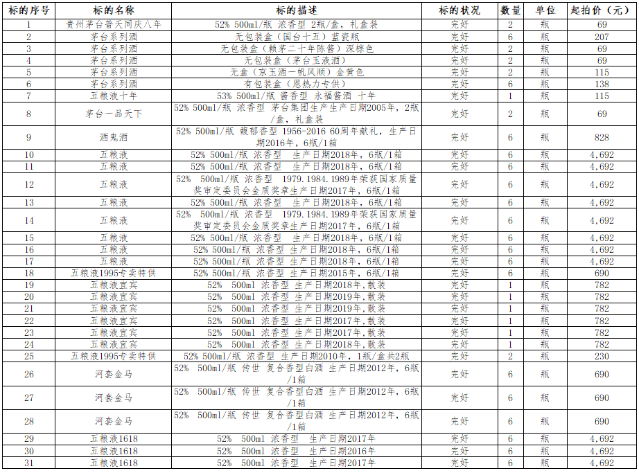 标的一:库存酒类整体打包起拍价578887元,保证金200000元,详情见以下清单(仅供参考)