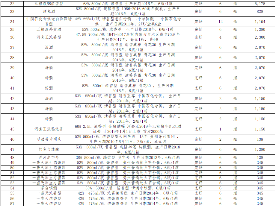 标的三:库存酒类整体打包起拍价2613985元,保证金500000元,详情见以下清单(仅供参考)