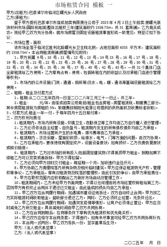 1、坐落于巴彦淖尔市临河区胜利北路东侧国际机电城(原曙光装饰材料市场)的31套商业房地产租赁权,面积约1558.75 ㎡,租期自2025年4月1日起至2028年3月31日止,租金包含房租、租赁税、取暖费三部分,参考价851100元(283700元/年),保证金170000元,竞买人须提供营业执照,经营范围包含房屋租赁和市场管理且经营期限在5年及以上,拍卖成交后,按照委托方要求签订租赁协议;