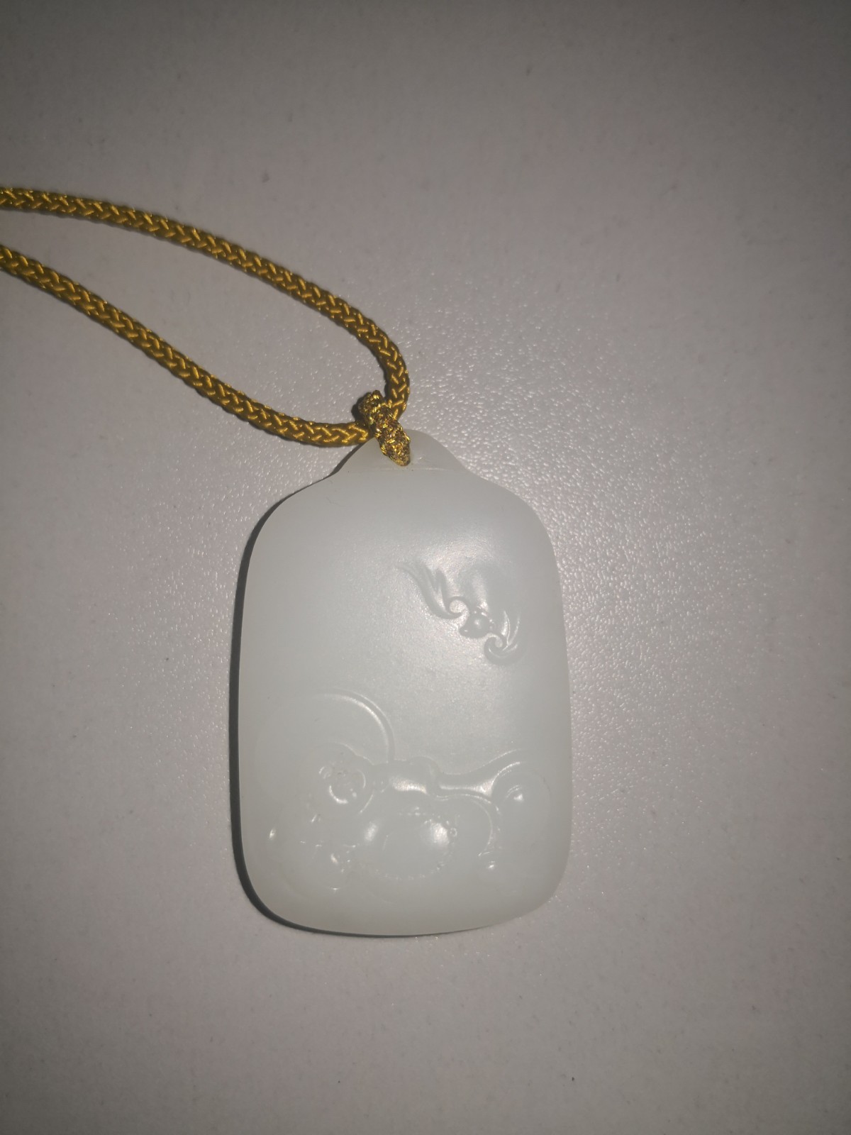 【描述】质地细腻油润,表面打磨得莹润光滑,采用浅浮雕工艺,雕刻了蝙蝠与祥云,寓意吉祥如意,福在眼前,挂件背部以回纹为底,中央雕刻了“吉祥”字样。顶部还有“佛”字,进一步强化了平安富贵,福气绵延的美好祝愿。