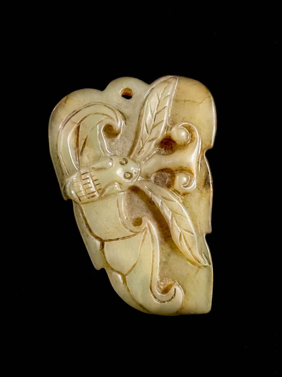 【描述】此件玉质细腻温润,整件是叶子形状,上面雕有蝙蝠,线条流畅,栩栩如生,寓意吉祥如意,象征富贵、福寿双全。