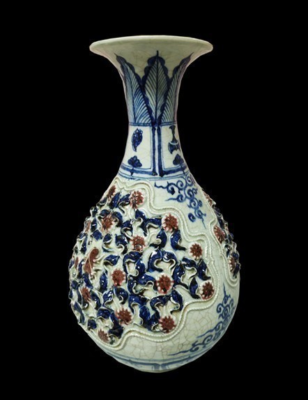 【描述】该瓶口呈喇叭状,细颈,垂腹,圈足,造型别致。其外壁通体以青花釉里红为纹饰,内口边则细腻地描绘着青花卷草纹。整器图案层次分明,从颈部的蕉叶纹到肩部的宝相花莲瓣纹,再到腹部的双边棱形开光和莲瓣纹,无不体现出匠人的匠心独运。特别值得一提的是,开光内堆塑的缠枝花叶和两种花纹,以青花饰叶、釉里红饰花朵,使得整器在色彩上既丰富又和谐。