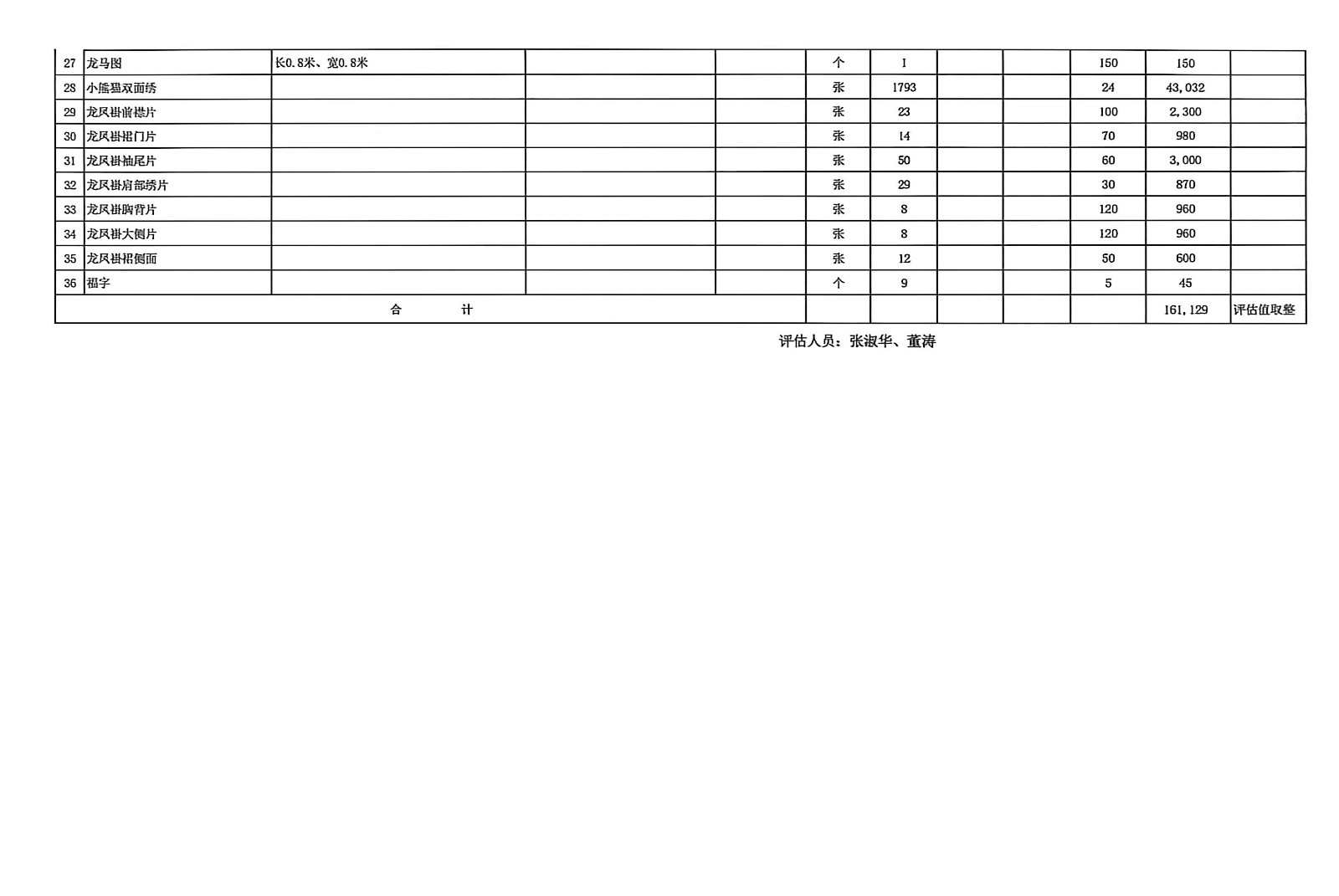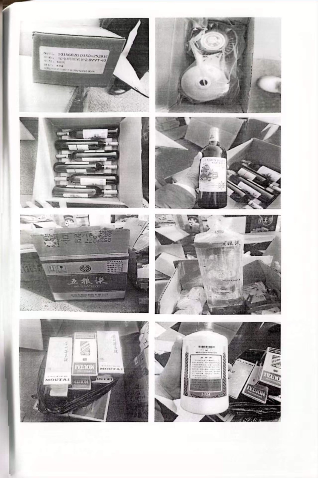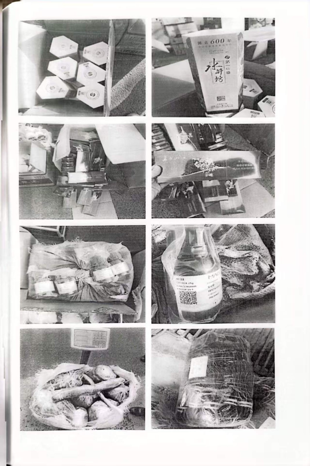 资产包括:发电机惰轮2个、汽车发动机1个、汽车发电机1个、汽车空调压缩机1个、发电机皮带1个、空气滤清器2个、机油滤清器3个、机油1箱、起动机1个、发电机涨紧轮(2.0VVT-43)1个、龙船轩易˙金舵干红葡萄酒 2箱、五粮液(浓香型白酒)2箱、贵州茅台酒(酱香型白酒)6瓶、水井坊酒˙臻酿八号(浓香型白酒)1箱、辛克宁4瓶、头发109.878斤、刺绣13项.