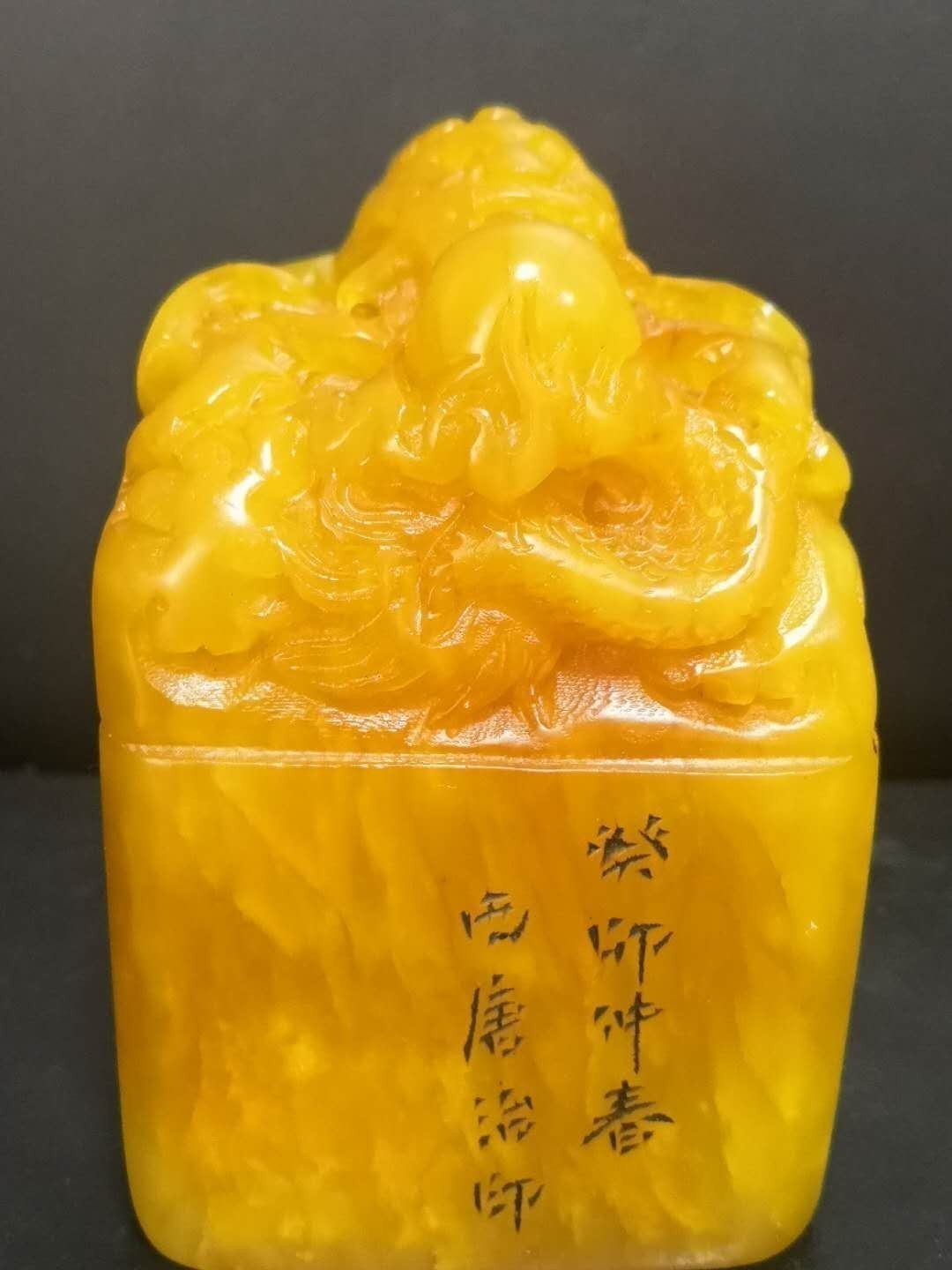 【描述】寿山石龙纽印章,取材寿山田黄石,名贵稀少,雕刻四方体龙纽印章,满工布局,龙纽生动,口吐龙珠,龙鳞层次分明,章身浮雕博古龙纹,保存完整。印文完好,传世精品!