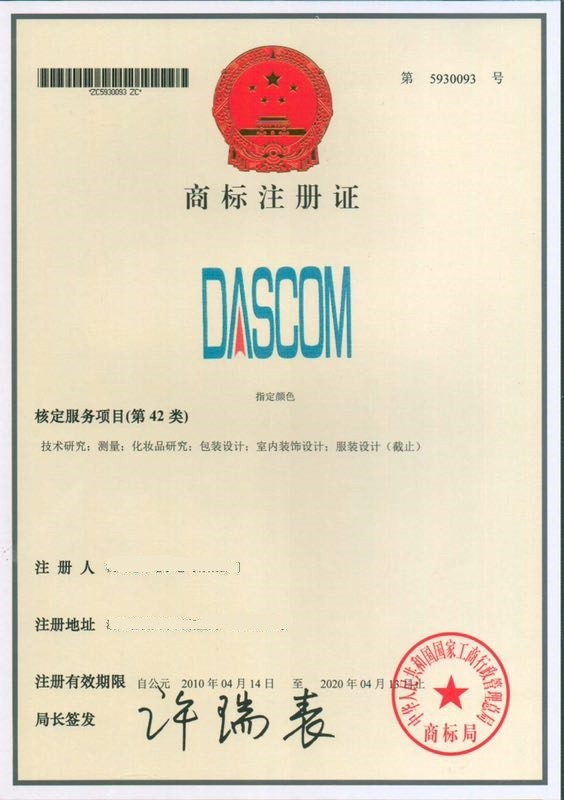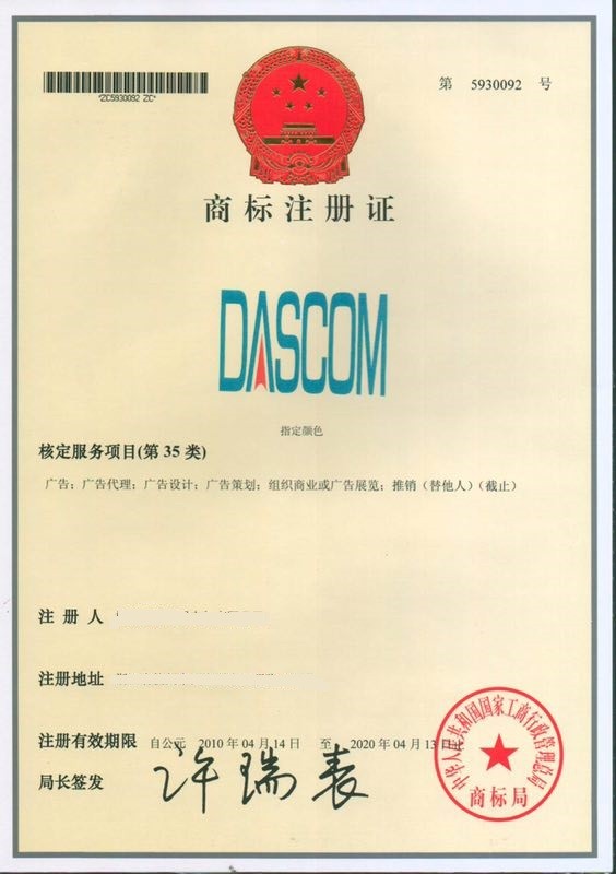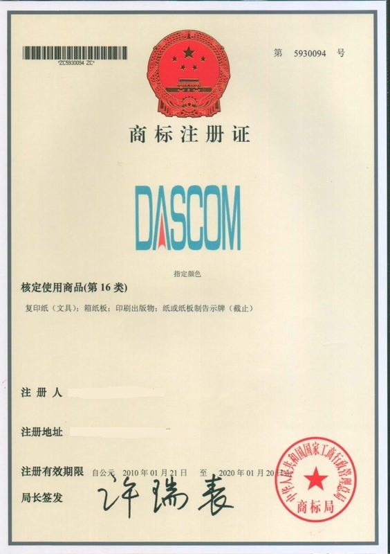 世界著名注册商标DASCOM(指定颜色)。核定服务项目(第42类)技术研究;测量;化妆品研究;包装设计;室内装饰设计;服装设计(截止);商标注册证第5930093号。核定服务项目(第35类)广告;广告代理;广告设计;广告策划;组织商业或广告展览;推销(其他人)(截止);商标注册证第5930092号。核定服务项目(第16类)复印纸(文具);箱板纸;印刷出版物;纸或纸板制告示牌(截止);商标注册证第5930094号。